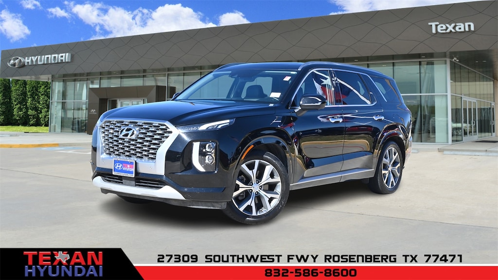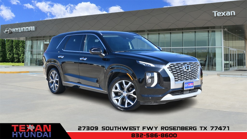 Certified. Black 2021 Hyundai Palisade Limited AWD 8-Speed Automatic with SHIFTRONIC V6 12 Speakers, 3.648 Axle Ratio, 3rd row seats: split-bench, 4-Wheel Disc Brakes, ABS brakes, Air Conditioning, Alloy wheels, AM/FM radio: SiriusXM, Apple CarPlay & Android Auto, Auto High-beam Headlights, Auto-dimming Rear-View mirror, Auto-leveling suspension, Automatic temperature control, Brake assist, Bumpers: body-color, Cargo Net, Cargo Tray, Carpeted Floor Mats, Compass, Delay-off headlights, Driver door bin, Driver vanity mirror, Dual front impact airbags, Dual front side impact airbags, Electronic Stability Control, Emergency communication system: Blue Link Connected Car Service (3-year complimentary subscription), Four wheel independent suspension, Front anti-roll bar, Front Bucket Seats, Front Center Armrest, Front dual zone A/C, Front reading lights, Fully automatic headlights, Garage door transmitter: HomeLink, harman/kardon® Speakers, Heads-Up Display, Heated & Ventilated Front Bucket Seats, Heated door mirrors, Heated front seats, Heated rear seats, Heated steering wheel, Illuminated entry, Knee airbag, Low tire pressure warning, Memory seat, Navigation System, Occupant sensing airbag, Option Group 01, Outside temperature display, Overhead airbag, Overhead console, Panic alarm, Passenger door bin, Passenger vanity mirror, Power door mirrors, Power driver seat, Power Liftgate, Power moonroof, Power passenger seat, Power steering, Power windows, Premium Nappa Leather Seat Trim, Radio data system, Radio: AM/FM/MP3 Premium Audio System, Rain sensing wipers, Rear air conditioning, Rear anti-roll bar, Rear reading lights, Rear window defroster, Rear window wiper, Reclining 3rd row seat, Remote keyless entry, Security system, Speed control, Speed-sensing steering, Split folding rear seat, Spoiler, Steering wheel mounted audio controls, Tachometer, Telescoping steering wheel, Tilt steering wheel, Tow Hitch, Traction control, Trip computer, Turn signal indicator mirrors, Variably intermittent wipers, Ventilated front seats, Ventilated rear seats, Wheel Locks, Wheels: 20" x 7.5J Split 5-Spoke Machined Alloy.
