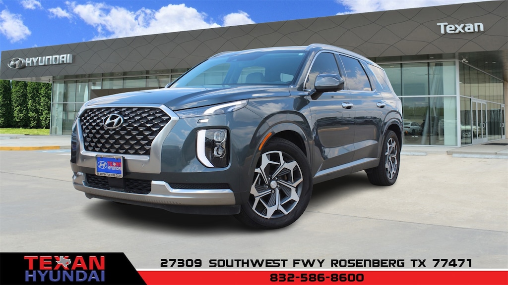 Certified. Gray 2022 Hyundai Palisade Calligraphy AWD 8-Speed Automatic with SHIFTRONIC V6 CARFAX One-Owner. 12 Speakers, 3.648 Axle Ratio, 3rd row seats: split-bench, 4-Wheel Disc Brakes, ABS brakes, Air Conditioning, Alloy wheels, AM/FM radio: SiriusXM, Apple CarPlay & Android Auto, Auto High-beam Headlights, Auto-dimming Rear-View mirror, Auto-leveling suspension, Automatic temperature control, Brake assist, Bumpers: body-color, Cargo Cover/Screen, Cargo Tray, Carpeted Floor Mats, Compass, Delay-off headlights, Driver door bin, Driver vanity mirror, Dual front impact airbags, Dual front side impact airbags, Electronic Stability Control, Emergency communication system: Blue Link Connected Car Service (3-year complimentary subscription), Four wheel independent suspension, Front anti-roll bar, Front Bucket Seats, Front Center Armrest, Front dual zone A/C, Front reading lights, Fully automatic headlights, Garage door transmitter: HomeLink, harman/kardon® Speakers, Heads-Up Display, Heated & Ventilated Front Bucket Seats, Heated door mirrors, Heated front seats, Heated rear seats, Heated steering wheel, Illuminated entry, Knee airbag, Low tire pressure warning, Memory seat, Navigation System, Occupant sensing airbag, Option Group 01, Outside temperature display, Overhead airbag, Overhead console, Panic alarm, Passenger door bin, Passenger vanity mirror, Power door mirrors, Power driver seat, Power Liftgate, Power moonroof, Power passenger seat, Power steering, Power windows, Premium Nappa Leather Seat Trim, Radio data system, Radio: AM/FM/MP3 Premium Audio System, Rain sensing wipers, Rear air conditioning, Rear anti-roll bar, Rear audio controls, Rear reading lights, Rear window defroster, Rear window wiper, Reclining 3rd row seat, Remote keyless entry, Security system, Speed control, Speed-sensing steering, Split folding rear seat, Spoiler, Steering wheel mounted audio controls, Tachometer, Telescoping steering wheel, Tilt steering wheel, Traction control, Trip computer, Turn signal indicator mirrors, Variably intermittent wipers, Ventilated front seats, Ventilated rear seats, Wheel Locks, Wheels: 20" x 7.5J Calligraphy Exclusive Alloy.