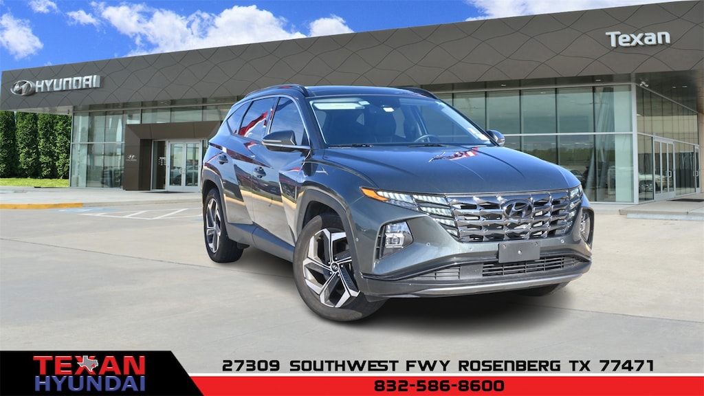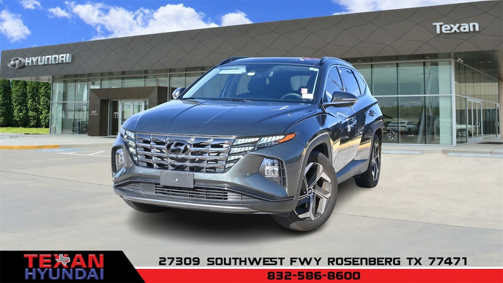 Certified. Gray 2023 Hyundai Tucson Limited FWD 8-Speed Automatic with SHIFTRONIC 2.5L I4 DGI DOHC 16V LEV3-ULEV70 187hp Clean CARFAX. CARFAX One-Owner. 3.648 Axle Ratio, 4-Wheel Disc Brakes, 8 Speakers, ABS brakes, Air Conditioning, Alloy wheels, AM/FM radio: SiriusXM, Apple CarPlay & Android Auto, Auto High-beam Headlights, Auto-dimming Rear-View mirror, Automatic temperature control, Brake assist, Bumpers: body-color, Cargo Net, Cargo Package, Cargo Tray, Carpeted Floor Mats, Delay-off headlights, Driver door bin, Driver vanity mirror, Dual front impact airbags, Dual front side impact airbags, Electronic Stability Control, Emergency communication system: Blue Link Connected Car Service (3-year complimentary subscription), First Aid Kit, Four wheel independent suspension, Front and Rear Mudguards, Front anti-roll bar, Front Bucket Seats, Front Center Armrest, Front dual zone A/C, Front reading lights, Fully automatic headlights, Garage door transmitter: HomeLink, Heated & Ventilated Front Bucket Seats, Heated door mirrors, Heated front seats, Heated rear seats, Heated steering wheel, Illuminated entry, Leather Seat Trim, Low tire pressure warning, Memory seat, Navigation System, Occupant sensing airbag, Option Group 01, Outside temperature display, Overhead airbag, Overhead console, Panic alarm, Passenger door bin, Passenger vanity mirror, Power door mirrors, Power driver seat, Power Liftgate, Power moonroof, Power passenger seat, Power steering, Power windows, Radio data system, Radio: Bose Premium w/AM/FM/HD/SiriusXM Audio System, Rain sensing wipers, Rear anti-roll bar, Rear Bumper Applique, Rear reading lights, Rear seat center armrest, Rear window defroster, Rear window wiper, Remote keyless entry, Roof rack: rails only, Security system, Speed control, Split folding rear seat, Spoiler, Steering wheel mounted audio controls, Tachometer, Telescoping steering wheel, Tilt steering wheel, Traction control, Trip computer, Turn signal indicator mirrors, Variably intermittent wipers, Ventilated front seats, Wheels: 19" x 7.5J" Machine-Face Finish Alloy.
