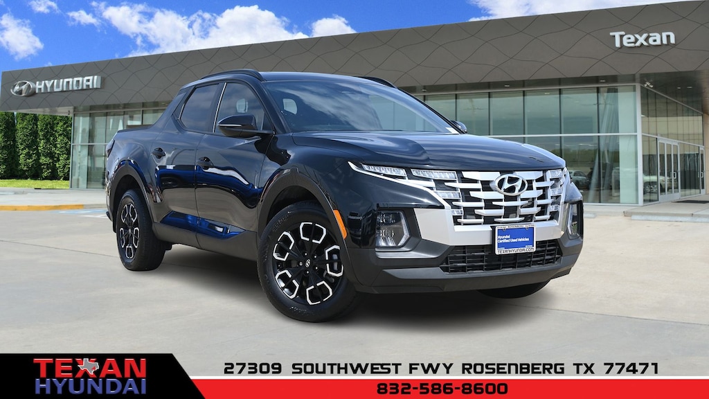 Certified. Black 2024 Hyundai Santa Cruz SEL Activity Package FWD 8-Speed Automatic with SHIFTRONIC 2.5L I4 Clean CARFAX. CARFAX One-Owner. 10.25" Digital Instrument Cluster, 115V AC Power Inverter in Bed, 15W Wireless Phone, 18" x 7.5J Alloy Wheels, 4-Wheel Disc Brakes, 4.081 Axle Ratio, 6 Speakers, ABS brakes, Activity Package, Air Conditioning, Alloy wheels, AM/FM radio: SiriusXM, Apple CarPlay & Android Auto, Auto High-beam Headlights, Auto-leveling suspension, Automatic temperature control, Bed Cargo Net, Bed Mat, Brake assist, Bumpers: body-color, Carpeted Floor Mats, Conventional Power Sunroof, Delay-off headlights, Driver door bin, Driver vanity mirror, Dual C-Channel Utility Tracks on Bed Side, Dual front impact airbags, Dual front side impact airbags, Electronic Stability Control, Emergency communication system: Bluelink+, Exterior Parking Camera Rear, First Aid Kit, Four wheel independent suspension, Front anti-roll bar, Front Bucket Seats, Front Center Armrest, Front dual zone A/C, Front reading lights, Fully automatic headlights, Heated door mirrors, Heated Front Bucket Seats, Heated front seats, Illuminated entry, Integrated Tonneau Cover, LED Bed Lighting, LED Front & Rear Interior Lights, Low tire pressure warning, Mud Guards, Occupant sensing airbag, Option Group 02, Outside temperature display, Overhead airbag, Overhead console, Panic alarm, Passenger door bin, Passenger vanity mirror, Power door mirrors, Power driver seat, Power steering, Power windows, Radio data system, Radio: AM/FM/HD Audio System, Radio: AM/FM/HD Audio System (P2), Rear anti-roll bar, Rear side impact airbag, Rear Sliding Glass Window w/Defroster, Rear step bumper, Rear window defroster, Remote keyless entry, Roof Side Rails, Security system, Speed control, Speed-sensing steering, Split folding rear seat, Spoiler, Stain & Odor Resistant Cloth Seat Trim, Steering wheel mounted audio controls, Tachometer, Telescoping steering wheel, Tilt steering wheel, Traction control, Trip computer, Turn signal indicator mirrors, Variably intermittent wipers, Wheel Locks.