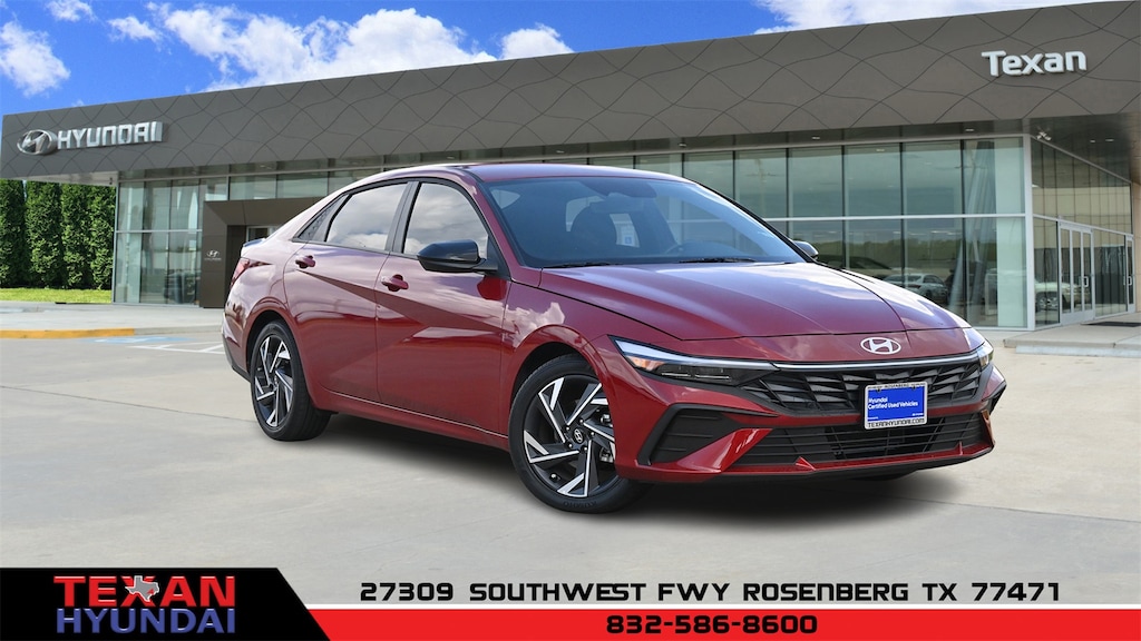 Certified. Red 2025 Hyundai Elantra SEL Sport FWD CVT I4 Clean CARFAX. CARFAX One-Owner. 17" x 7.0J Alloy Wheels, 4-Wheel Disc Brakes, 6 Speakers, ABS brakes, Air Conditioning, All-Season Fitted Liners, Alloy wheels, AM/FM radio, Apple CarPlay & Android Auto, Auto High-beam Headlights, Automatic temperature control, Brake assist, Bumpers: body-color, Cargo Net, Carpeted Floor Mats, Delay-off headlights, Driver door bin, Driver vanity mirror, Dual front impact airbags, Dual front side impact airbags, Electronic Stability Control, Exterior Parking Camera Rear, First Aid Kit, Front anti-roll bar, Front Bucket Seats, Front Center Armrest, Front dual zone A/C, Front reading lights, Front wheel independent suspension, Fully automatic headlights, Illuminated entry, Leather Shift Knob, Leather steering wheel, Low tire pressure warning, Occupant sensing airbag, Option Group 01, Outside temperature display, Overhead airbag, Overhead console, Panic alarm, Passenger door bin, Passenger vanity mirror, Power door mirrors, Power steering, Power windows, Premium Cloth Seat Trim, Radio: AM/FM/HD Display Audio, Rear side impact airbag, Rear window defroster, Remote keyless entry, Security system, Speed control, Speed-sensing steering, Spoiler, Steering wheel mounted audio controls, Tachometer, Telescoping steering wheel, Tilt steering wheel, Traction control, Trip computer, Variably intermittent wipers.
