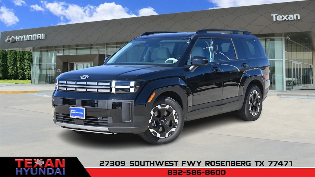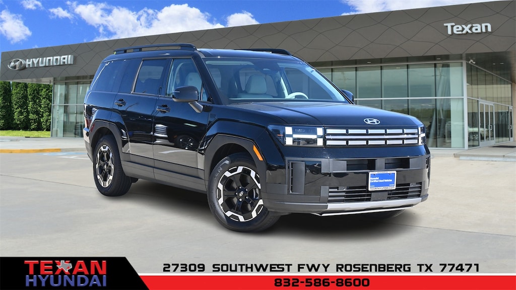 Certified. Black 2026 Hyundai Santa Fe SEL FWD 8-Speed Automatic with SHIFTRONIC 2.5L I4 Clean CARFAX. CARFAX One-Owner. Gray w/H-Tex Leatherette Seat Trim, 18" x 7.5J Alloy Wheels, 3rd row seats: bench, 4-Wheel Disc Brakes, 6 Speakers, ABS brakes, Air Conditioning, All Season Fitted Liners, Alloy wheels, AM/FM radio: SiriusXM, Apple CarPlay & Android Auto, Auto High-beam Headlights, Automatic temperature control, Brake assist, Bumpers: body-color, Cargo Blocks, Cargo Net, Cargo Organizer, Cargo Tray, Carpeted Floor Mats, Delay-off headlights, Driver door bin, Driver vanity mirror, Dual front impact airbags, Dual front side impact airbags, Electronic Stability Control, Emergency communication system, Exterior Parking Camera Rear, First Aid Kit, Four wheel independent suspension, Front anti-roll bar, Front Bucket Seats, Front Center Armrest, Front dual zone A/C, Front reading lights, Fully automatic headlights, H-Tex Leatherette Seat Trim, Heated door mirrors, Heated Front Bucket Seats, Heated front seats, Illuminated entry, Knee airbag, Leather steering wheel, Low tire pressure warning, Occupant sensing airbag, Option Group 01, Outside temperature display, Overhead airbag, Overhead console, Panic alarm, Passenger door bin, Passenger vanity mirror, Power door mirrors, Power driver seat, Power Liftgate, Power steering, Power windows, Radio: AM/FM/HD Display Audio, Rear anti-roll bar, Rear seat center armrest, Rear side impact airbag, Rear window defroster, Rear window wiper, Remote keyless entry, Security system, Speed control, Speed-sensing steering, Split folding rear seat, Spoiler, Steering wheel mounted audio controls, Tachometer, Telescoping steering wheel, Tilt steering wheel, Traction control, Trip computer, Turn signal indicator mirrors, Variably intermittent wipers.