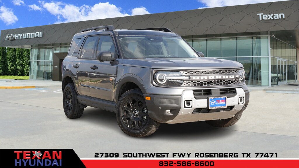 Gray 2025 Ford Bronco Sport Badlands 4WD 8-Speed Automatic EcoBoost 2.0L I4 GTDi DOHC Turbocharged VCT Clean CARFAX. CARFAX One-Owner. 4-Wheel Disc Brakes, 6 Speakers, ABS brakes, Air Conditioning, Alloy wheels, AM/FM radio: SiriusXM, AM/FM Stereo, Auto High-beam Headlights, Auto-dimming Rear-View mirror, Automatic temperature control, Brake assist, Compass, Delay-off headlights, Driver door bin, Driver vanity mirror, Dual front impact airbags, Dual front side impact airbags, Electronic Stability Control, Emergency communication system: SYNC 4 911 Assist, Equipment Group 400A, Four wheel independent suspension, Front anti-roll bar, Front Bucket Seats, Front Center Armrest, Front fog lights, Front License Plate Bracket, Front reading lights, Fully automatic headlights, Garage door transmitter, Heated door mirrors, Heated front seats, Heated steering wheel, Illuminated entry, Knee airbag, Leather Trimmed Front Bucket Seats, Low tire pressure warning, Memory seat, Occupant sensing airbag, Outside temperature display, Overhead airbag, Overhead console, Panic alarm, Passenger door bin, Passenger vanity mirror, Power door mirrors, Power driver seat, Power passenger seat, Power steering, Power windows, Radio data system, Rear anti-roll bar, Rear reading lights, Rear seat center armrest, Rear window defroster, Rear window wiper, Remote keyless entry, Security system, SiriusXM, Speed control, Speed-sensing steering, Speed-Sensitive Wipers, Split folding rear seat, Steering wheel mounted audio controls, SYNC 4 w/Enhanced Voice Recognition, Tachometer, Telescoping steering wheel, Tilt steering wheel, Traction control, Trip computer, Variably intermittent wipers, Wheels: 17" Matte Black-Painted Aluminum.