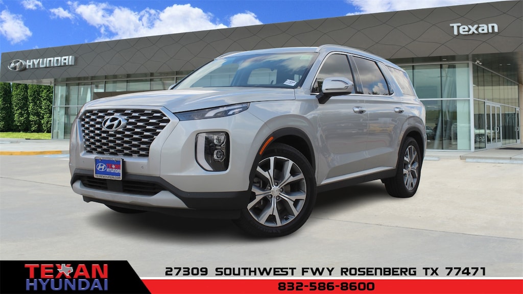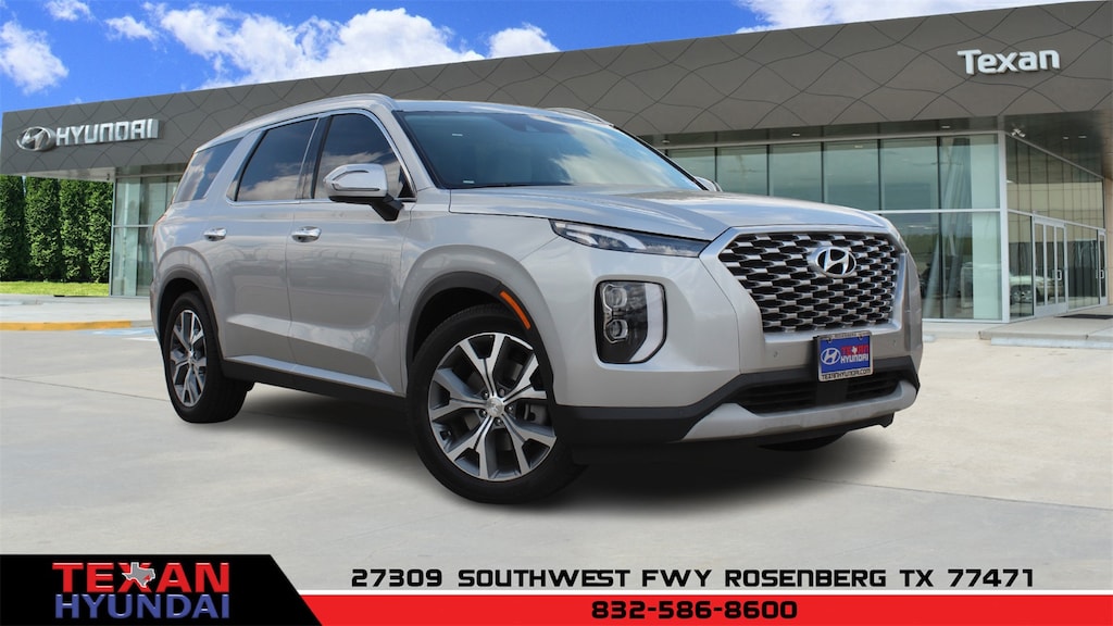 Silver 2021 Hyundai Palisade SEL Premium Package FWD 8-Speed Automatic with SHIFTRONIC V6 CARFAX One-Owner. 115-Volt AC Power Outlet, 3.648 Axle Ratio, 3rd row seats: split-bench, 3rd Row USB Outlets, 4-Wheel Disc Brakes, 6 Speakers, 7" High-Resolution Cluster Display, 8-Way Power Passenger Seat, ABS brakes, Acoustic Front Side Glass, Air Conditioning, Alloy wheels, AM/FM radio, Apple CarPlay & Android Auto, Auto High-beam Headlights, Auto Leveling Rear Suspension, Auto-dimming Rear-View mirror, Automatic temperature control, Brake assist, Bumper Applique, Bumpers: body-color, Cargo Cover/Screen, Cargo Net, Cargo Tray, Carpeted Floor Mats, Cloth Seat Trim, Convenience Package P2, Delay-off headlights, Driver door bin, Driver vanity mirror, Driver's Seat Integrated Memory System, Dual front impact airbags, Dual front side impact airbags, Electronic Stability Control, First Aid Kit, Four wheel independent suspension, Front anti-roll bar, Front Bucket Seats, Front Center Armrest, Front dual zone A/C, Front Parking Sensors, Front reading lights, Fully automatic headlights, Garage door transmitter: HomeLink, Hands-Free Smart Liftgate, Heated 2nd Row Seats, Heated door mirrors, Heated Front Bucket Seats, Heated front seats, Heated Steering Wheel, Highway Drive Assist I, Illuminated entry, Knee airbag, Leather Seat Trim, LED Taillights, Low tire pressure warning, Mudguards, Navigation System, Occupant sensing airbag, Outside temperature display, Overhead airbag, Overhead console, Panic alarm, Passenger door bin, Passenger vanity mirror, Power 3rd Row Seating, Power door mirrors, Power driver seat, Power moonroof, Power steering, Power windows, Premium Dashboard & Door Armrests, Premium Package, Premium Package P3, Radio data system, Radio: AM/FM/MP3 Display Audio, Radio: AM/FM/MP3 Premium Audio System, Rear air conditioning, Rear anti-roll bar, Rear reading lights, Rear Side Window Sunshades, Rear window defroster, Rear window wiper, Reclining 3rd row seat, Remote keyless entry, Security system, Speed control, Speed-sensing steering, Split folding rear seat, Spoiler, Steering wheel mounted audio controls, Tachometer, Telescoping steering wheel, Tilt steering wheel, Traction control, Trip computer, Turn signal indicator mirrors, Ultrasonic Rear Occupant Alert, Variably intermittent wipers, Wheel Locks, Wheels: 18" x 7.5J Machine Finish Alloy, Wheels: 20" x 7.5J Split 5-Spoke Machined Alloy, Wireless Phone Charger.