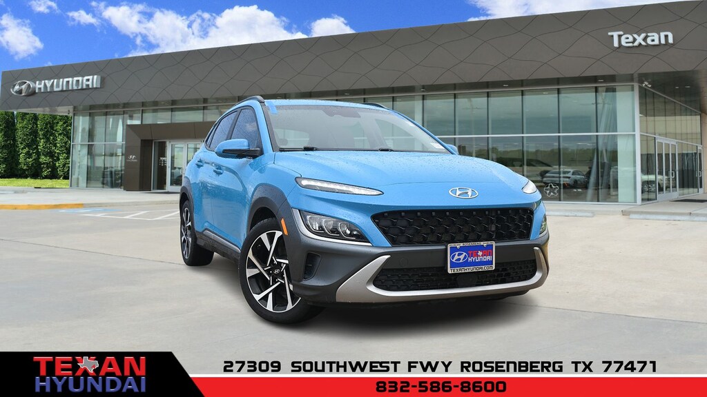 Blue 2022 Hyundai Kona Limited FWD 7-Speed Automatic 1.6L I4 DGI Turbocharged DOHC 16V LEV3-ULEV70 195hp CARFAX One-Owner. 3.174 Axle Ratio, 4-Wheel Disc Brakes, 8 Speakers, ABS brakes, Air Conditioning, Alloy wheels, AM/FM radio: SiriusXM, Apple CarPlay & Android Auto, Auto High-beam Headlights, Auto-dimming Rear-View mirror, Automatic temperature control, Brake assist, Bumpers: body-color, Cargo Net, Cargo Package, Cargo Tray, Carpeted Floor Mats, Delay-off headlights, Driver door bin, Driver vanity mirror, Dual front impact airbags, Dual front side impact airbags, Electronic Stability Control, Emergency communication system: Blue Link Connected Car Service (3-year complimentary subscription), Exterior Parking Camera Rear, Front & Rear Mudguards, Front anti-roll bar, Front Bucket Seats, Front Center Armrest, Front reading lights, Front wheel independent suspension, Fully automatic headlights, Garage door transmitter: HomeLink, harman/kardon® Speakers, Heated door mirrors, Heated Front Bucket Seats, Heated front seats, Illuminated entry, Leather Seat Trim, Leather Shift Knob, Leather steering wheel, Low tire pressure warning, Navigation System, Occupant sensing airbag, Option Group 01, Overhead airbag, Overhead console, Panic alarm, Passenger door bin, Passenger vanity mirror, Power door mirrors, Power driver seat, Power moonroof, Power steering, Power windows, Radio: Harman Kardon Premium Audio System, Rain sensing wipers, Rear Bumper Applique, Rear seat center armrest, Rear window defroster, Rear window wiper, Remote keyless entry, Security system, Speed control, Speed-sensing steering, Split folding rear seat, Spoiler, Steering wheel mounted audio controls, Tachometer, Telescoping steering wheel, Tilt steering wheel, Traction control, Trip computer, Turn signal indicator mirrors, Variably intermittent wipers, Wheel Locks, Wheels: 18 x 7.5J Alloy.