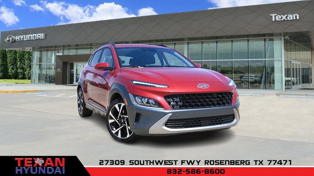 Red 2022 Hyundai Kona Limited FWD 7-Speed Automatic 1.6L I4 DGI Turbocharged DOHC 16V LEV3-ULEV70 195hp Clean CARFAX. CARFAX One-Owner. 3.174 Axle Ratio, 4-Wheel Disc Brakes, 8 Speakers, ABS brakes, Air Conditioning, Alloy wheels, AM/FM radio: SiriusXM, Apple CarPlay & Android Auto, Auto High-beam Headlights, Auto-dimming Rear-View mirror, Automatic temperature control, Brake assist, Bumpers: body-color, Carpeted Floor Mats, Delay-off headlights, Driver door bin, Driver vanity mirror, Dual front impact airbags, Dual front side impact airbags, Electronic Stability Control, Emergency communication system: Blue Link Connected Car Service (3-year complimentary subscription), Exterior Parking Camera Rear, Front anti-roll bar, Front Bucket Seats, Front Center Armrest, Front reading lights, Front wheel independent suspension, Fully automatic headlights, Garage door transmitter: HomeLink, harman/kardon® Speakers, Heated door mirrors, Heated Front Bucket Seats, Heated front seats, Illuminated entry, Leather Seat Trim, Leather Shift Knob, Leather steering wheel, Low tire pressure warning, Navigation System, Occupant sensing airbag, Option Group 01, Overhead airbag, Overhead console, Panic alarm, Passenger door bin, Passenger vanity mirror, Power door mirrors, Power driver seat, Power moonroof, Power steering, Power windows, Radio: Harman Kardon Premium Audio System, Rain sensing wipers, Rear Bumper Applique, Rear seat center armrest, Rear window defroster, Rear window wiper, Remote keyless entry, Security system, Speed control, Speed-sensing steering, Split folding rear seat, Spoiler, Steering wheel mounted audio controls, Tachometer, Telescoping steering wheel, Tilt steering wheel, Traction control, Trip computer, Turn signal indicator mirrors, Variably intermittent wipers, Wheel Locks, Wheels: 18 x 7.5J Alloy.