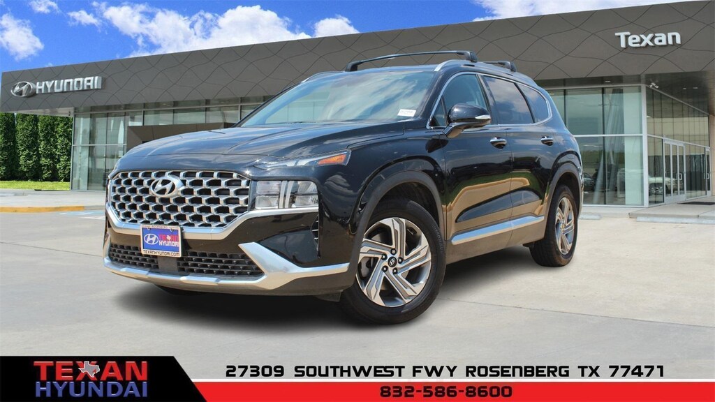 Black 2022 Hyundai Santa Fe SEL Convenience Package FWD 8-Speed Automatic with SHIFTRONIC 2.5L I4 CARFAX One-Owner. Black Cloth, 12.3" LCD Multi-Information Display, 18" x 7.5J Alloy Wheels, 4-Wheel Disc Brakes, 6 Speakers, ABS brakes, Acoustic-Laminated Front Side Windows, Air Conditioning, Alloy wheels, AM/FM radio: SiriusXM, Apple CarPlay & Android Auto, Auto High-beam Headlights, Auto-Dimming Rear-View Mirror, Axle Ratio: 3.798, Brake assist, Bumper Applique, Bumpers: body-color, Cargo Cover/Screen, Cargo Net, Carpeted Floor Mats, Convenience Package (DISC), Delay-off headlights, Driver door bin, Driver vanity mirror, Dual Automatic Temperature Control, Dual front impact airbags, Dual front side impact airbags, Electronic Stability Control, Emergency communication system, Exterior Parking Camera Rear, Four wheel independent suspension, Front anti-roll bar, Front Bucket Seats, Front Center Armrest, Front reading lights, Fully automatic headlights, Hands-Free Smart Liftgate w/Hands-Free Auto Open, Heated door mirrors, Heated Front Bucket Seats, Heated front seats, Heated Side Mirrors w/Turn Signal Indicators, Hyundai Digital Key, Illuminated entry, Leather Wrapped Steering Wheel, Low tire pressure warning, Manual Rear Side Sunshades, Navigation System, Occupant sensing airbag, Option Group 02, Outside temperature display, Overhead airbag, Overhead console, Panic alarm, Passenger door bin, Passenger vanity mirror, Power door mirrors, Power driver seat, Power Release 2nd Row Seats, Power steering, Power windows, Puddle Lamps, Radio: AM/FM Display Audio, Rear anti-roll bar, Rear seat center armrest, Rear window defroster, Rear window wiper, Remote keyless entry, Security system, Speed control, Speed-sensing steering, Split folding rear seat, Spoiler, Steering wheel mounted audio controls, Tachometer, Telescoping steering wheel, Tilt steering wheel, Traction control, Trip computer, Ultrasonic Rear Occupant Alert, Variably intermittent wipers, Wheel Locks, YES Essentials Stain-Resistant Cloth Seat Trim.