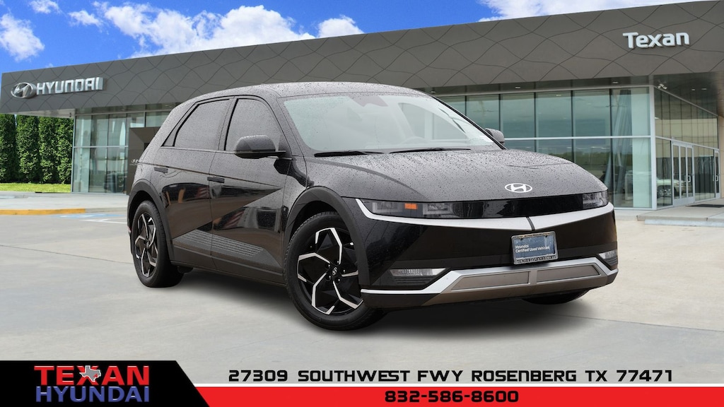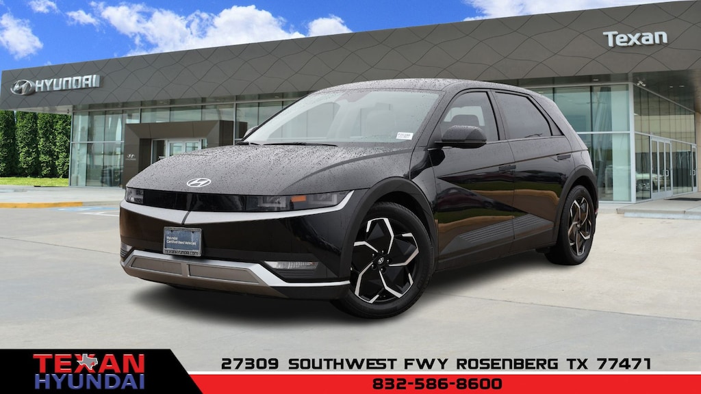 Certified. Black 2023 Hyundai IONIQ 5 SE RWD 1-Speed Automatic Electric Motor Clean CARFAX. 4-Wheel Disc Brakes, 4.706 Axle Ratio, 6 Speakers, ABS brakes, Air Conditioning, Alloy wheels, AM/FM radio: SiriusXM, Apple CarPlay & Android Auto, Auto High-beam Headlights, Automatic temperature control, Bodyside moldings, Brake assist, Bumpers: body-color, Cargo Net, Carpeted Floor Mats, Delay-off headlights, Driver door bin, Driver vanity mirror, Dual front impact airbags, Dual front side impact airbags, Electronic Stability Control, Emergency communication system: Blue Link Connected Car Service (3-year complimentary subscription), Four wheel independent suspension, Front anti-roll bar, Front Bucket Seats, Front Center Armrest w/Storage, Front dual zone A/C, Front reading lights, Fully automatic headlights, harman/kardon® Speakers, Heated door mirrors, Heated Front Bucket Seats, Heated front seats, Illuminated entry, Leather steering wheel, Low tire pressure warning, Mudguards, Navigation System, Occupant sensing airbag, Option Group 01, Outside temperature display, Overhead airbag, Overhead console, Panic alarm, Passenger door bin, Passenger vanity mirror, Power door mirrors, Power driver seat, Power steering, Power windows, Radio: AM/FM/SiriusXM/HD Display Audio System, Rear anti-roll bar, Rear reading lights, Rear seat center armrest, Rear window defroster, Remote keyless entry, Security system, Speed control, Speed-sensing steering, Split folding rear seat, Spoiler, Stain-Resistant Cloth Seating Surfaces, Steering wheel mounted audio controls, Telescoping steering wheel, Tilt steering wheel, Traction control, Trip computer, Turn signal indicator mirrors, Up Seatback Cargo Mat, Variably intermittent wipers, Wheels: 19" x 7.5J Aero Alloy.