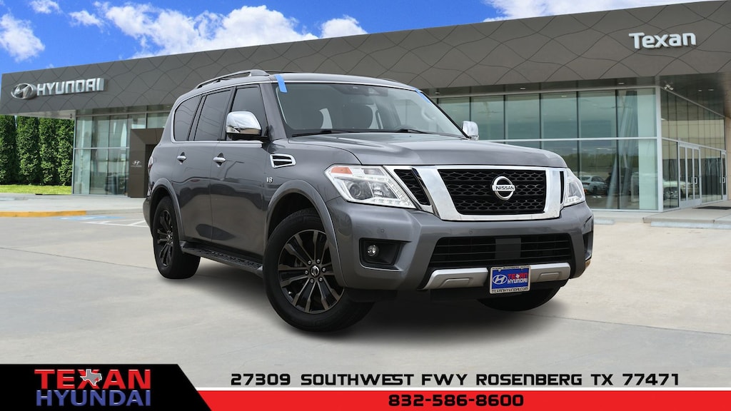 Gray 2018 Nissan Armada Platinum RWD 7-Speed Automatic 5.6L V8 DOHC 32V Endurance Clean CARFAX. CARFAX One-Owner. 13 Speakers, 2.937 Axle Ratio, 3rd row seats: split-bench, 4-Wheel Disc Brakes, A/V remote, ABS brakes, Air Conditioning, Alloy wheels, AM/FM radio: SiriusXM, Anti-whiplash front head restraints, Auto tilt-away steering wheel, Auto-dimming door mirrors, Auto-dimming Rear-View mirror, Auto-leveling suspension, Automatic temperature control, Brake assist, Bumpers: body-color, Captain Seat Package, Carpeted Floor Mats w/ Captain Seat Package, CD player, Delay-off headlights, Driver door bin, Driver vanity mirror, Dual front impact airbags, Dual front side impact airbags, Electronic Stability Control, Emergency communication system: NissanConnect Services, Four wheel independent suspension, Front anti-roll bar, Front Bucket Seats, Front Center Armrest, Front dual zone A/C, Front fog lights, Front reading lights, Fully automatic headlights, Garage door transmitter: HomeLink, Headphones, Heated & Cooled Front Bucket Seats w/Driver Memory, Heated door mirrors, Heated front seats, Heated rear seats, Heated steering wheel, Illuminated entry, Interior Lighting Package, Lane Departure Warning System, Leather Shift Knob, Leather-Appointed Seat Trim, Low tire pressure warning, Memory seat, Navigation System, Occupant sensing airbag, Outside temperature display, Overhead airbag, Overhead console, Panic alarm, Passenger door bin, Passenger vanity mirror, Power door mirrors, Power driver seat, Power Liftgate, Power moonroof, Power passenger seat, Power steering, Power windows, Radio data system, Radio: Bose AM/FM/SXM/CD/MP3/HD Radio, Rain sensing wipers, Rear air conditioning, Rear anti-roll bar, Rear reading lights, Rear seat center armrest, Rear window defroster, Rear window wiper, Reclining 3rd row seat, Remote keyless entry, Roof rack: rails only, Roof Rail Cross Bars, Second Row Captain's Chairs, Second Row Center Console w/ Padded Armrest, Security system, Speed control, Speed-sensing steering, Speed-Sensitive Wipers, Split folding rear seat, Spoiler, Steering wheel memory, Steering wheel mounted audio controls, Tachometer, Telescoping steering wheel, Tilt steering wheel, Traction control, Trip computer, Turn signal indicator mirrors, Variably intermittent wipers, Ventilated front seats, Voltmeter, Wheels: 20" Machine-Faced Chrome w/Tinted CC.