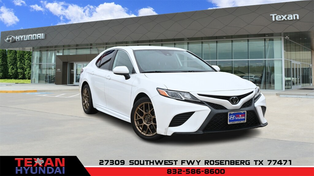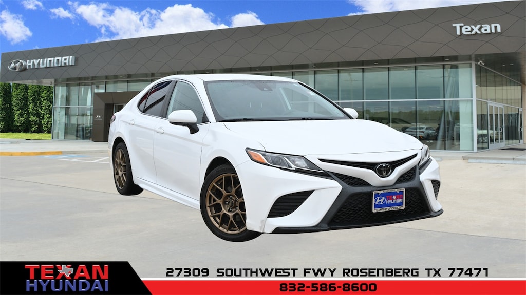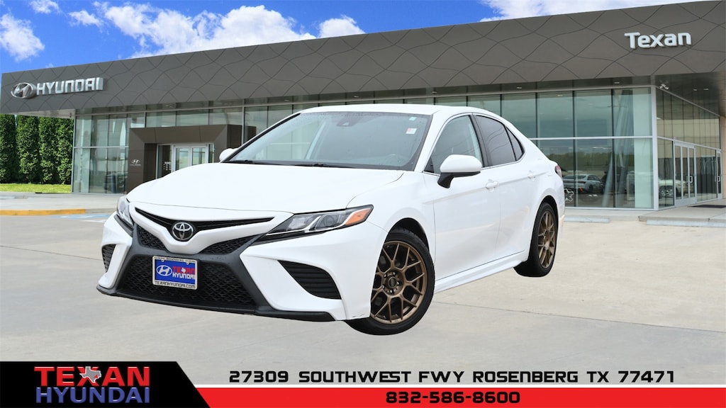 White 2019 Toyota Camry L FWD 8-Speed Automatic 2.5L I4 DOHC 16V Black w/Quilted Perforated Leather Seat Trim, 4-Wheel Disc Brakes, 6 Speakers, ABS brakes, Air Conditioning, AM/FM radio, Apple CarPlay, Auto High-beam Headlights, Brake assist, Bumpers: body-color, Delay-off headlights, Driver door bin, Driver vanity mirror, Dual front impact airbags, Dual front side impact airbags, Electronic Stability Control, Emergency communication system: Safety Connect, Exterior Parking Camera Rear, Four wheel independent suspension, Front anti-roll bar, Front Bucket Seats, Front Center Armrest, Front reading lights, Fully automatic headlights, Illuminated entry, Knee airbag, Low tire pressure warning, Occupant sensing airbag, Outside temperature display, Overhead airbag, Overhead console, Panic alarm, Passenger door bin, Passenger vanity mirror, Power door mirrors, Power steering, Power windows, Radio data system, Radio: Entune 3.0 Audio w/App Suite, Rear anti-roll bar, Rear reading lights, Rear side impact airbag, Rear window defroster, Remote keyless entry, Speed control, Speed-sensing steering, Steering wheel mounted audio controls, Tachometer, Telescoping steering wheel, Tilt steering wheel, Traction control, Trip computer, Variably intermittent wipers.